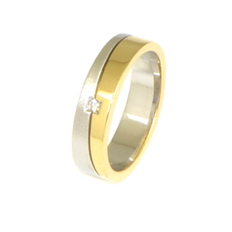 Aliança de casament de disseny bicolor. Aquesta original aliança és combinada en or blanc amb acabat setinat i groc brillant separats per una línia que va de menys a més, a la part superior té encastat un diamant. Fa un ample de 5.3 mil·límetres per 1.8 d'alta i el seu interior és pla.