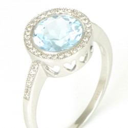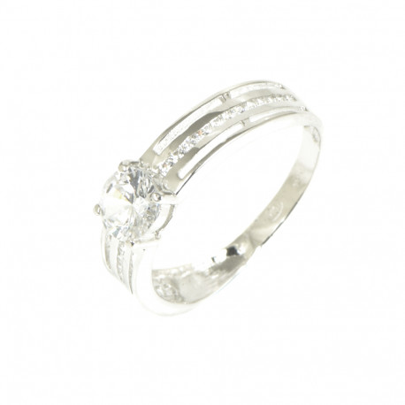 Anell fabricat en or blanc de 18 klts amb una circonita a la part superior subjecta per quatre urpes, ambdós costats del braç està adornada amb una fila de circonites muntades en carril, mesura 5.5 mil·límetres d'amplada a la part superior i el seu pes és de 1.9 grams.
