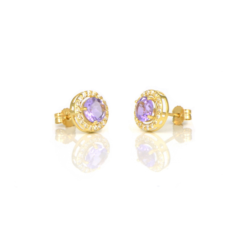 Arracadas en or de 18 kts amb forma de rosetó, la pedra central i principal és una bonica ametista i està envoltada per circonites, totes les pedres estan encastades en arpes. Fa un diàmetre de 8.6 mil·límetres i el seu pes és de 1.3 grams. Tancament a pressió.
