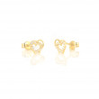 Arracades fabricades en or groc de 18 Kts amb forma de silueta de doble cor un amb circonites en pavé, mesura 7.5 mil·límetres d'ample i el seu tancament és a pressió. Pesen 0.7 grams.