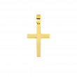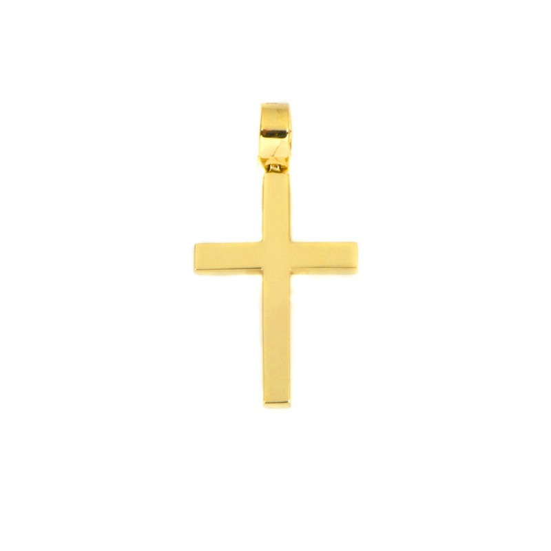 Creu fabricada en or groc de 18 kts, aquesta creu és totalment llisa amb acabat brillant, mesura 18 mil·límetres d'amplada i 33 de llarga incloent l'anella, el seu pes és de 4.7 grams.