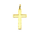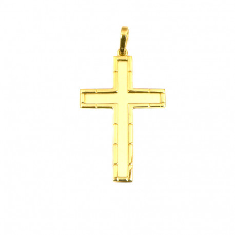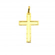 Cruz fabricada en oro amarillo de 18 kts plana de interior matizado y borde brillante, mide 40 milímetros de largo incluyendo la anilla y 22 de ancho, su peso es de 2,7 gramos.