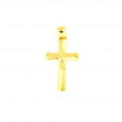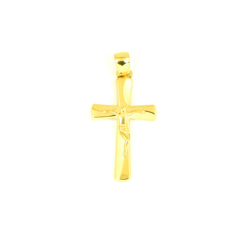 Creu fabricada en or groc de 18 kts llisa d'acabat brillant i setinat amb imatge de crist al centre, mesura 37 mil·límetres d'alta incloent l'anella i 18 d'ampla el pes és de 3.2 grams.
