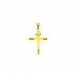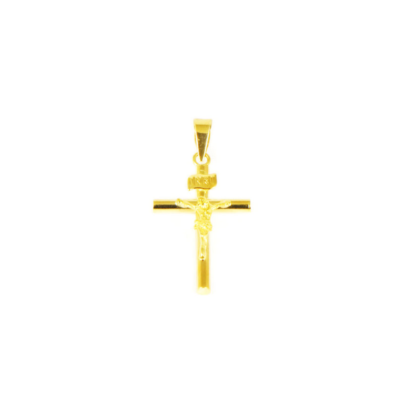 Creu fabricada en or groc de 18 kts de canya rodona llisa d'acabat brillant amb imatge de crist al centre, mesura 29 mil·límetres d'alta incloent l'anella i 15 d'ampla el pes és de 0.8 grams.