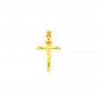 Creu fabricada en or groc de 18 kts de canya rodona llisa d'acabat brillant amb imatge de crist al centre, mesura 29 mil·límetres d'alta incloent l'anella i 14 d'ampla el pes és de 0.7 grams.