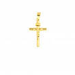 Creu fabricada en or groc de 18 klts de canya rodona llisa d'acabat brillant amb imatge de crist al centre, mesura 29 mil·límetres d'alta incloent l'anella i 14 d'ampla el pes és de 0.7 grams.