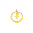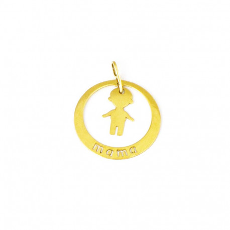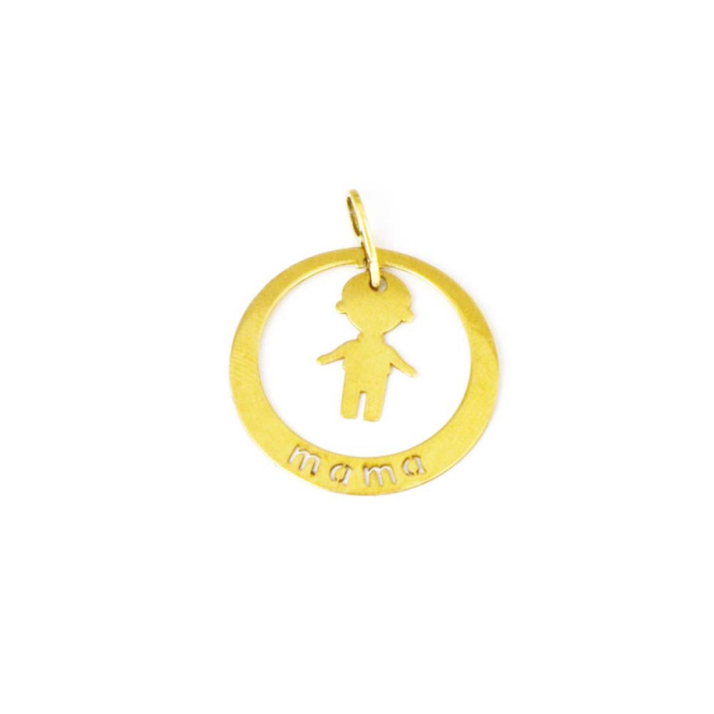 Penjoll fabricat en or de 18 kts de forma circular amb un nen penjant de la seva part superior, la part inferior de l'cercle té la inscripció mama, mesura 24 mil·límetres d'alt inclosa l'anella per 20 d'ample, el seu pes és d'1 gram.