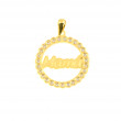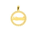 Penjoll fabricat en or de 18 kts en forma de cercle amb circonites a la part exterior i el nom mama dins, mesura 26 mil·límetres d'alt inclosa l'anella per 20 d'amplada, el pes és de 0.9 grams.