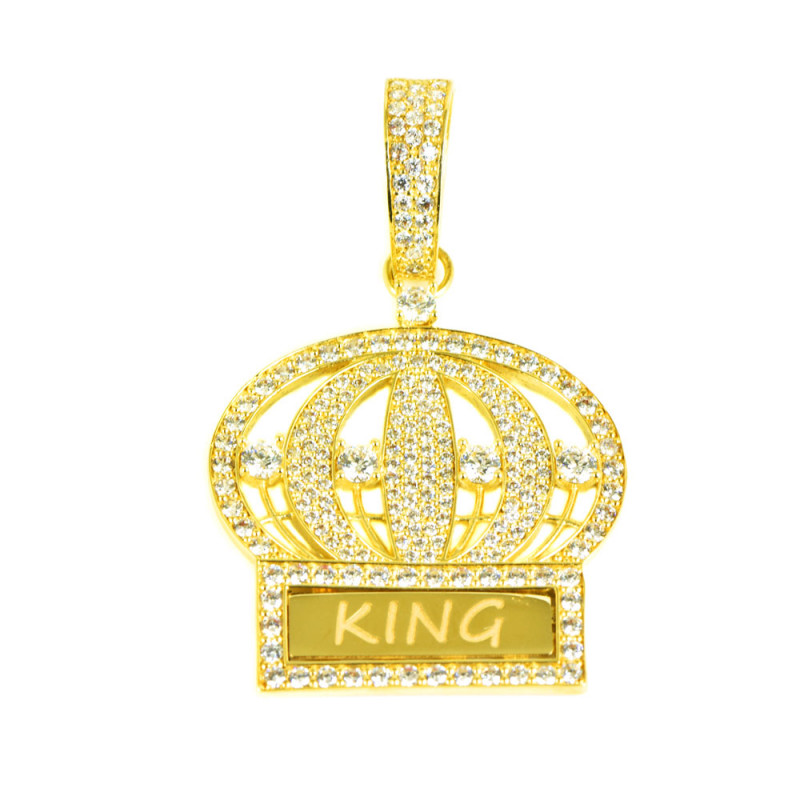 Penjoll fabricat en or de 18 Klts amb forma de corona amb circonites clavades a l'interior i la paraula KING a sota. Mesura 55 mil·límetres d'alt inclosa la seva anella per 33 d'amplada i el pes és de 12.9 grams.