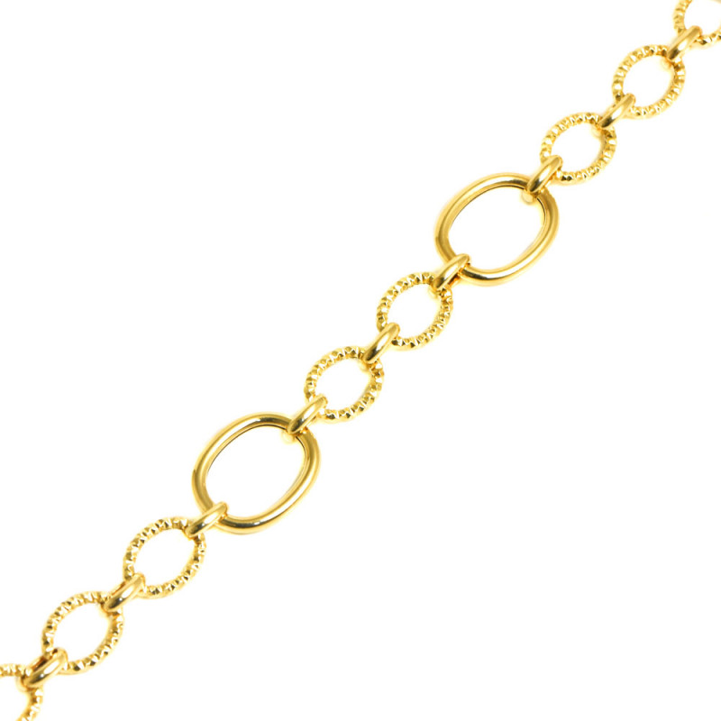 Polsera fabricada en or de 18 kilates amb baules de dues diferents mides algunes de les quals tenen un bonic gravat lapidat, mesura 20 centímetres de llarg i 17 mil·límetres d'amplada, el seu tancament és de tipus flotador i pesa 6.4 grams.