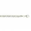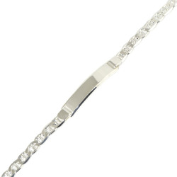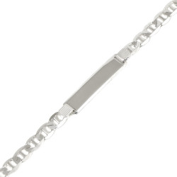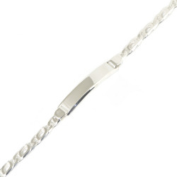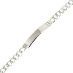 Polsera fabricada en plata de llei amb placa per a gravat, mesura 20,5 centímetres de llarga i 6 mil·límetres d'ampla, pesa 8.6 grams i el seu tancament és de mosquetó.