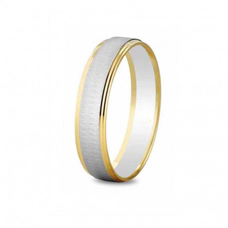 Alianza de boda bicolor de diseño original en oro de 18K con diseño texturizado en su banda central de oro blanco y cantos aterrazados en acabado brillante. Ancho: 4,5mm. Interior plano.
