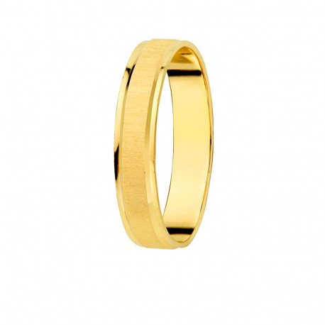 Alianza fabricada en oro amarillo de 18 klts con un bonito satinado en el centro y vorde brillante, mide 3.5 milímetros de ancha y 0.8 milímetro de alta.