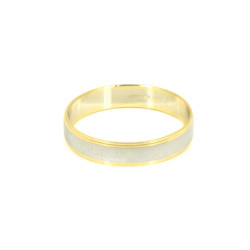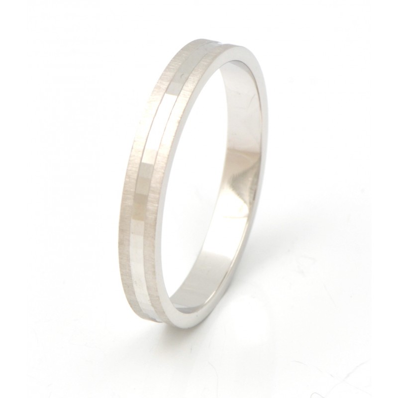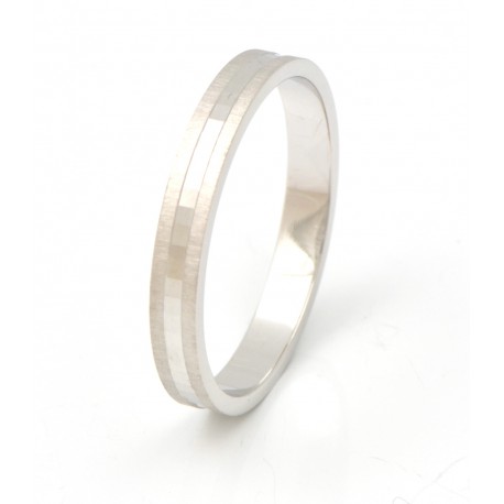 Alianza fabricada en oro blanco de 18 kts ,con la parte exterior satinada y un luminoso grabado diamantado en el centro. Mide 3.3 milímetros de ancha y 1.2 milímetros de alta. Tiene un peso aproximado de 4 gramos en medida 24.