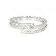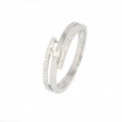 Anillo de oro blanco de 18 kilates con diamantes , el brazo del anillo se compone de tres partes una parte central donde se haya un diamante sujeto por dos brazos que se cruzan, estos brazos tienen múltiples diamantes engastados. Hace un ancho de 5.7 milímetros por 2.3 de alto y pesa 2.5 gramos. Presentado en estuche de regalo y con certificado de calidad.