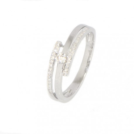 No olvide guardar su personalización para poder añadir al carritoAnillo de oro blanco de 18 kilates con diamantes , el brazo del anillo se compone de tres partes una parte central donde se haya un diamante sujeto por dos brazos que se cruzan, estos brazos tienen múltiples diamantes engastados. Hace un ancho de 5.7 milímetros por 2.3 de alto y pesa 2.5 gramos. Presentado en estuche de regalo y con certificado de calidad.
