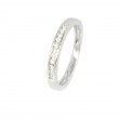 Anillo de diamantes en oro blanco de 18 kilates con 11 diamantes que hacen un peso de 0.11 cts , están montados en montura carril formando una bonita media alianza, mide 2.4 milímetros de ancho por 2.1 de alto en su parte superior y su peso es de 2 gramos. Presentado en estuche de regalo y con certificado de calidad.