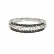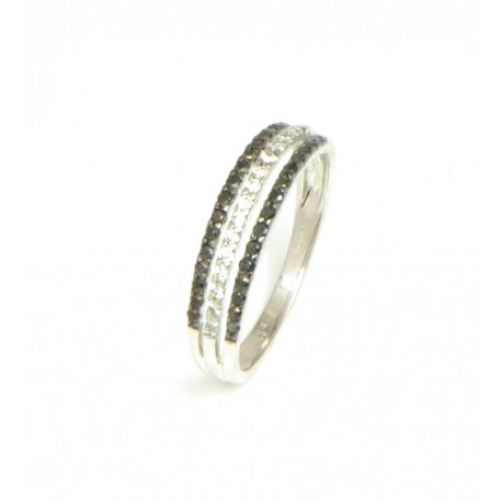 Anillo de oro blanco de 18 kilates con triple brazo en su parte superior, los brazos exteriores con diamantes negros y el interior con diamantes blancos, todos ellos van sujetos con garras y hacen un peso de 11 qts. Mide 4.7 milímetros en su parte superior por 2.3 de alto y su peso es de 2.3 gramos.Presentado en estuche de regalo con certificado de calidad.