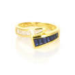 Elegante anillo fabricado en oro amarillo de 18 kilates cruzado en la parte superior, en uno de sus lados tiene 7 zafiros azules en talla baguet , el otro seis diamantes talla princesa calidad HSI con un peso de 0.34 cts. Hace un ancho en su parte superior de 9 milímetros y su peso es de 4.7 gramos. Entregado en estuche de regalo con certificado de calidad.