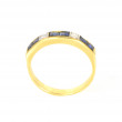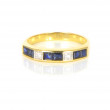 Anillo fabricado en oro amarillo de 18 kilates con zafiros talla princesa montados en carril y dos diamantes en su parte superior, los diamantes hacen un total de 0.03 Cts y están sujetos con garras . Pesa 3 gramos y mide 3.6 milímetros de ancho. Presentado en estuche de regalo y con certificado de calidad.
