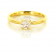 Anillo de diamantes fabricado en oro de 18 Klts con diamantes en su parte superior engastados en garras, entre todas hacen un peso de 0.15 qts y son calidad HSI, mide 5 milímetros de ancho y 4.5 de alto en su parte central. Su peso es de 2.8 gramos.