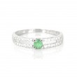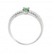 Este anillo fabricado en oro blanco de 18 Kts tiene como piedra principal una bonita esmeralda, ambos lados del brazo está adornado con circonitas, todas las piedras van sujetas con garras. Mide 4 milímetros de ancho en su parte superior y su peso es de 1.5 gramos. Presentado en estuche de regalo.