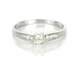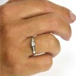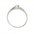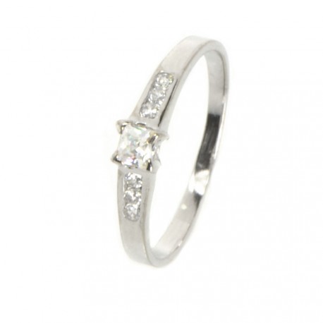 Anillo de oro blanco de 18 quilates. Los dos lados del brazo de este anillo están adornados con tres circonitas en montura carril que realzan piedra central de mayor tamaño y engastada con cuatro garras, el conjunto forma un elegante solitario. Mide 4 milímetros de ancho por 3.8 de alto y su peso es de 1.5 gramos.
