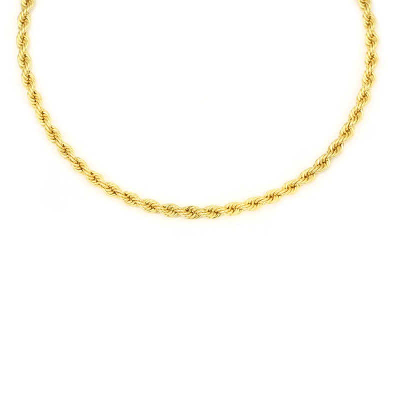 Cordón fabricado en oro 18 kts de 4.5 milímetros de grosor y 50 centímetros de largo. Pesa 11.3 gramos y su cierre es de mosquetón.