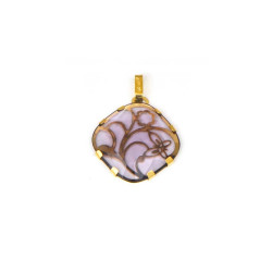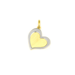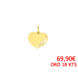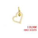 Colgante de oro amarillo 18 Kts con forma de corazón, éste pende por uno de sus lados y su parte exterior va pavonada de circonitas sujetas todas ellas por garras, en la parte superior pende un pequeño corazón. Mide 11 milímetros de ancho y 26 de alto incluyendo su valía. Pesa 0.6 gramos.