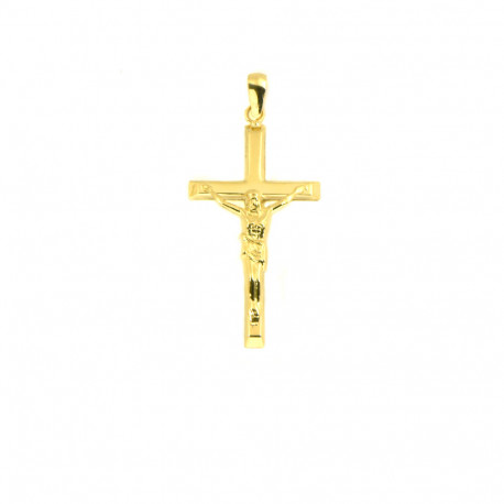 Cruz fabricada en oro amarillo de 18 klts de caña plana lisa de acabado brillante con imagen de cristo en el centro, mide 32 milímetros de alta incluyendo la anilla y 16 de ancha su peso es de 0.7 gramos.