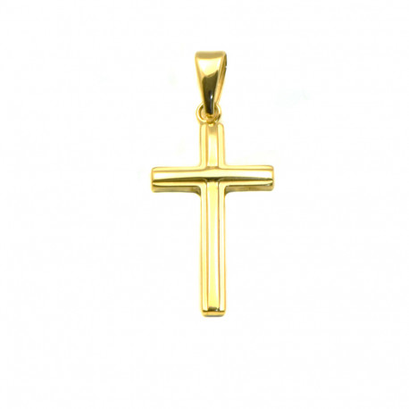 Cruz fabricada en oro amarillo de 18 klts, esta cruz combina el acabado satinado con uno brillante, mide 16 milímetros de ancho por 39 de alto incluyendo la valía y su peso es de 1.7 gramos.