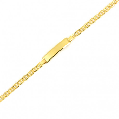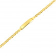 No olvide guardar su personalización para poder añadir al carritoPulsera oro amarillo de 18 kilates con placa de 30 milímetros de larga y 6 de ancha en la parte central, la pulsera es modelo ancla, mide 20.5 centímetros de larga y su cierre es de mosquetón. Su peso es de 5.8 gramos.