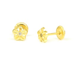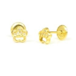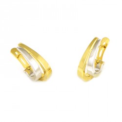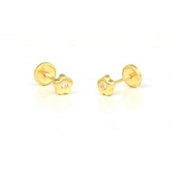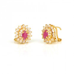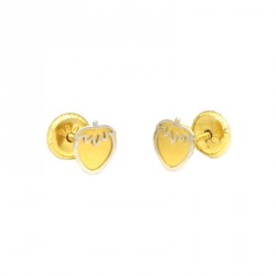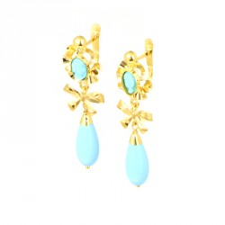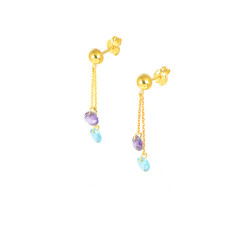 Pendientes fabricados en oro amarillo de 18 kts de 30 milímetros de largo, la parte superior del cierre es un círculo del que salen dos cadenas, una tiene en su extremo una piedra lila y la otra mas larga tiene una de color azul. Su cierre es a presión y pesan 0.8 gramos.