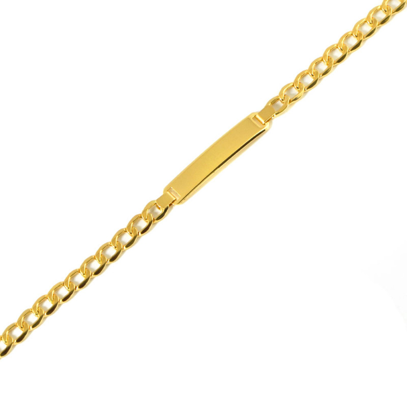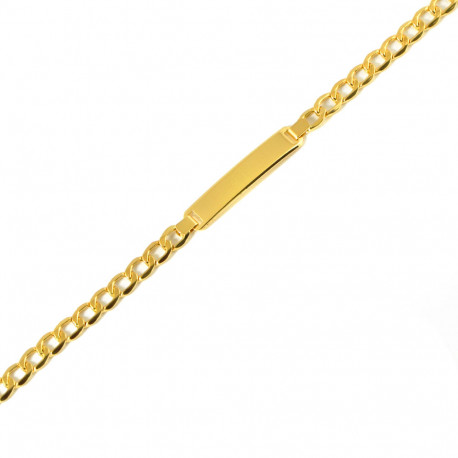 No olvide guardar su personalización para poder añadir al carritoPulsera fabricada en oro amarillo de 18 kilates con placa de 2.5 milímetros de larga y 5 milímetros de ancha en la parte central, la placa tiene acabado brillante, la pulsera es barbada, cierre de mosquetón. Su peso es de 3.8 gramos, mide 18 centímetros de larga.