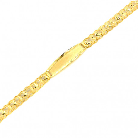 No olvide guardar su personalización para poder añadir al carritoPulsera fabricada en oro de 18 kilates, la pulsera es princesa y la placa satinada tiene el borde con un bonito grabado diamantado, mide 10.5 milímetros de ancha y mide 19 centímetros. Su peso es de 14.1 gramos. Cierre de cajón y de ocho.