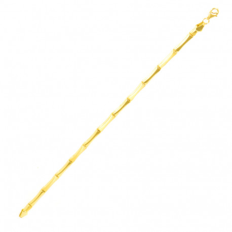 Pulsera fabricada en oro de 18 kilates , esta pulsera combina el oro con acabado amarillo brillante y acabado mate en un bonito diseño, hace un ancho de 3.5 milímetros por 19.5 de largo y su peso es de 5.6 gramos. Cierre de mosquetón.