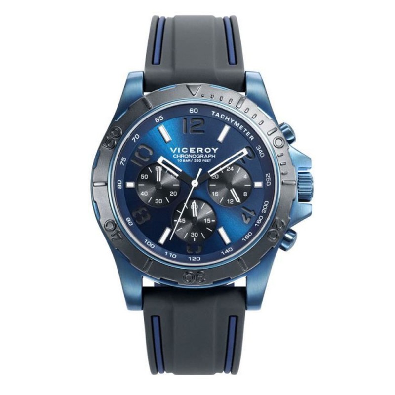 Reloj Viceroy Hombre cronógrafo colección HEAT 471205-35 fabricado en acero y aluminio , en color gris y azul. La caja mide 44 milímetros de diámetro por 12 de alto, su esfera combina los colores negro y azul, la correa es de silicona azul y gris. Resistente al agua 10 atmósferas. Caja a rosca.