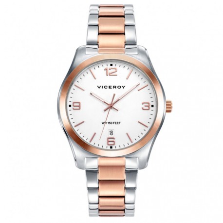 Reloj Viceroy Hombre 401173-95 Bicolor Acero plateado y Rosado. La caja y brazalete son de acero bicolor, la esfera es blanca con dígitos y agujas rosadas. Calendario. El cierre es oculto lo que le confiere un toque elegante. Cristal mineral, maquinaria de cuarzo. El tamaño de la caja es de 41 milímetros de diámetro por 10 de alto. Sumergible 10 atmósferas.