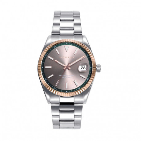 Reloj Viceroy 42439-97 colección Chic para hombre. Caja en acero con bisel elegante troquelado ip rosa y brazalete de acero con cierre desplegable con doble pulsador de seguridad. Esfera en gris con bisel interno verde. Cristal con lupa en calendario en la posición de las tres. Tapa cerrada a rosca, resistente al agua 100 metros. Diámetro de 41 milímetros. Estuche y garantía de tres años.